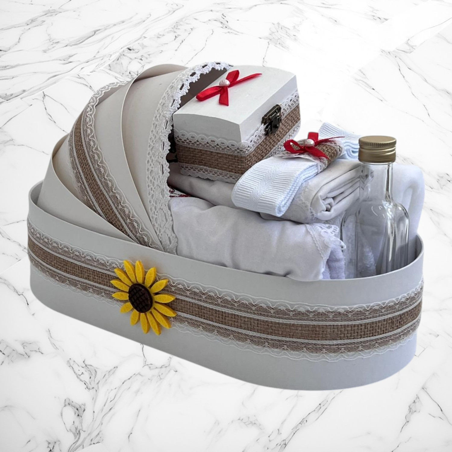 📦 Ambalaj: Toate elementele trusoului sunt așezate într-o cutie albă din carton, în formă de landou, decorată cu fundă și perlute