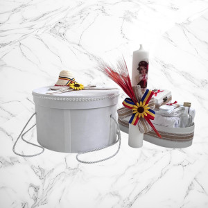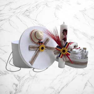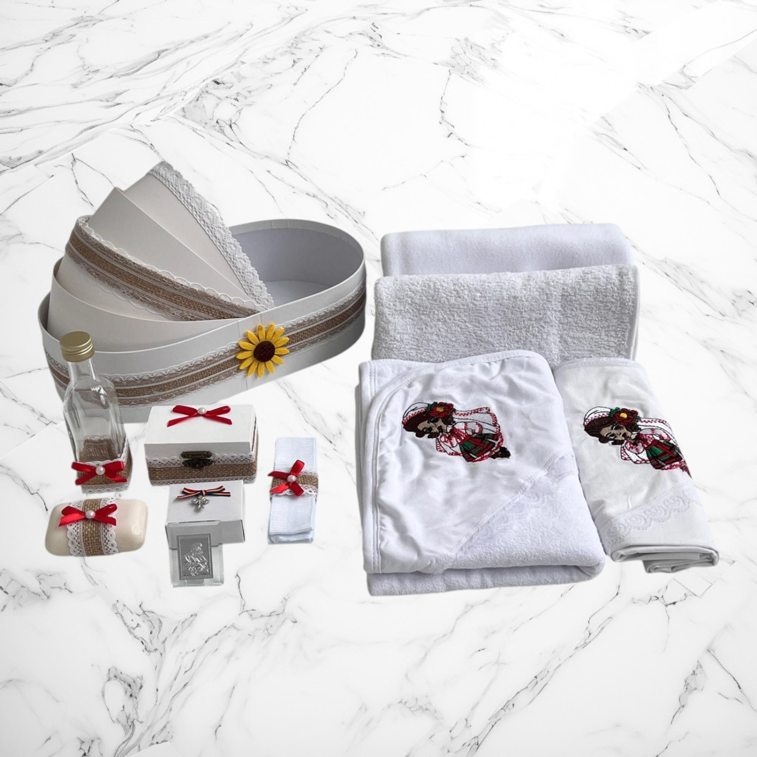 Alege un set de botez tradițional, cu design autentic românesc, perfect pentru ceremonia de creștinare a micuțului tău. Setul conține o lumânare decorată cu motive populare și un trusou complet, realizat din materiale de înaltă calitate, cu dantelă și broderii fine și o cutie pentru hăinuțe.👶✨