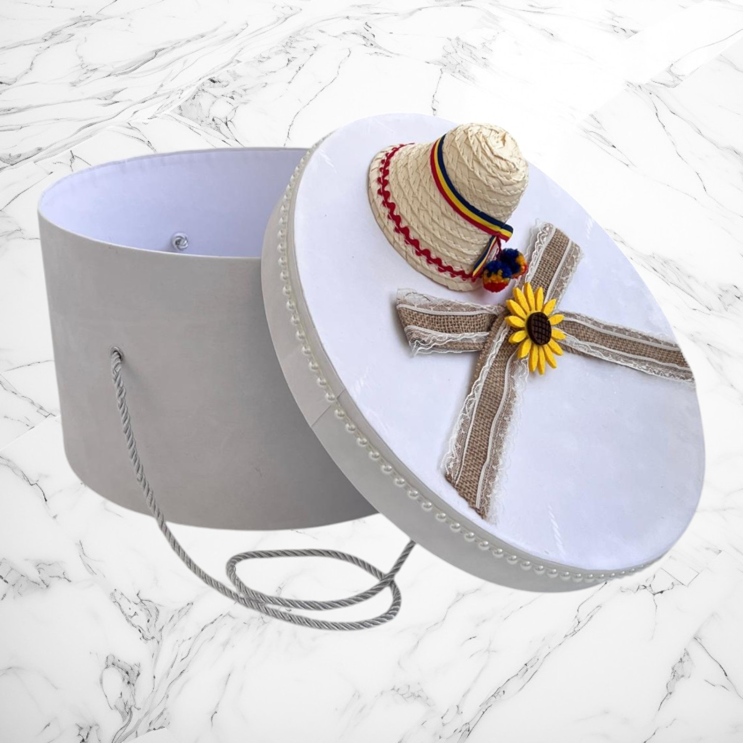 📦 Ambalaj: Toate elementele trusoului sunt așezate într-o cutie albă din carton, în formă de landou, decorată cu fundă și perlute