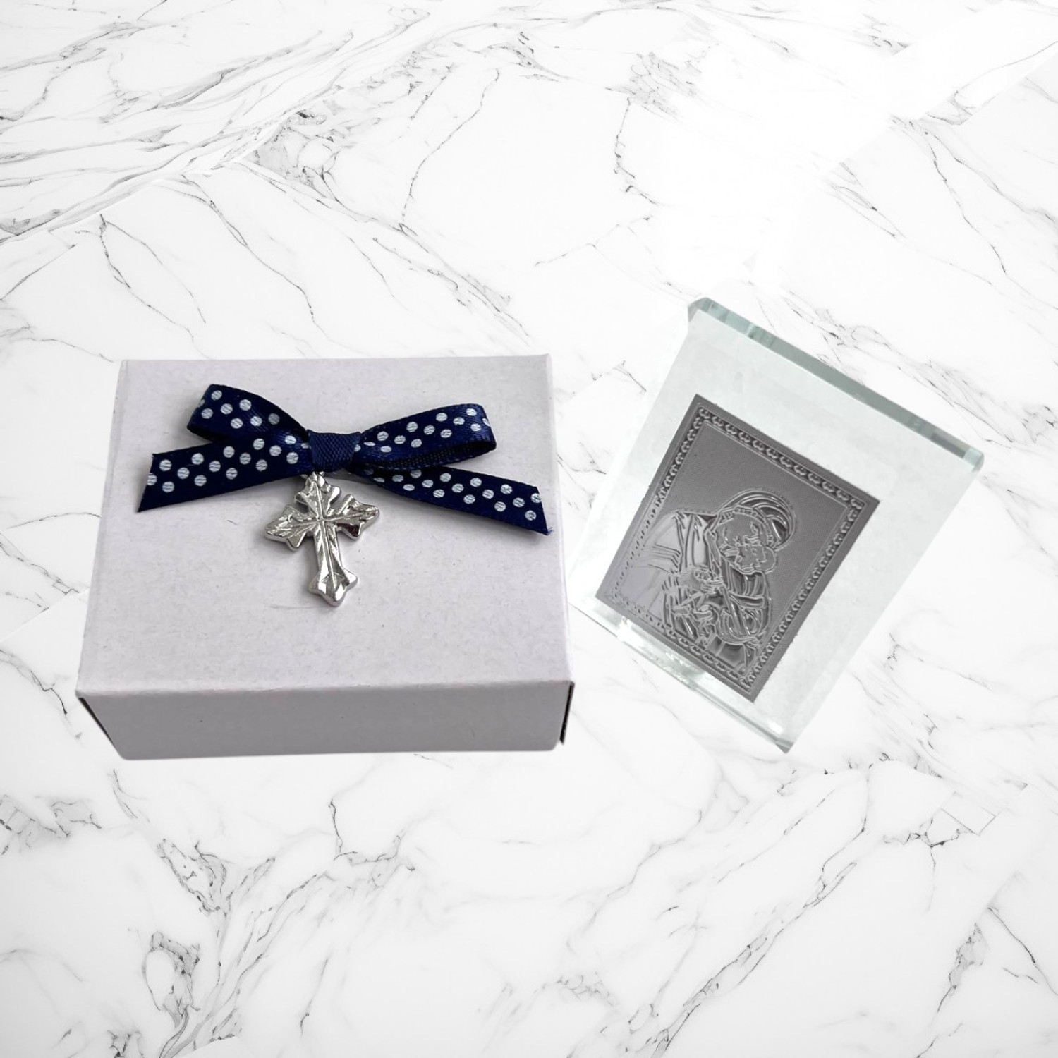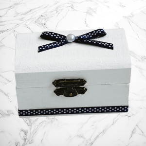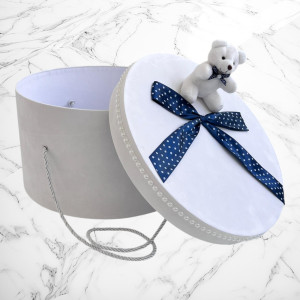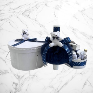 Comanda acum produsul "Set botez Lumânare, Trusou, Cutie hainuțe ursuleț bleumarin cu buline".