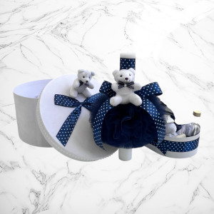 Set botez Lumânare, Trusou, Cutie hainuțe ursuleț bleumarin cu buline