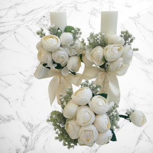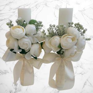 2 lumânări de nuntă, decorate cu bujori ivory și accente florale fine