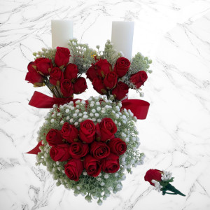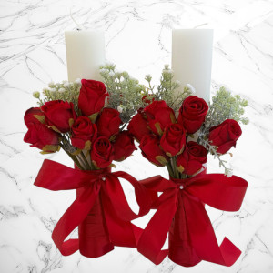 Setul este realizat manual și include lumânări de nuntă decorate cu trandafiri grena, buchet de mireasă asortat și cocardă pentru mire, toate concepute pentru un aspect unitar și armonios în cadrul ceremoniei religioase și al evenimentului.