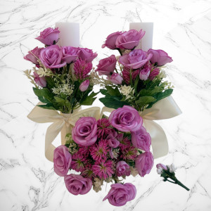 Setul este realizat manual și include lumânări de nuntă decorate cu trandafiri lila, buchet de mireasă asortat și cocardă pentru mire, toate concepute pentru a crea un aspect unitar și elegant în ziua cea mare.