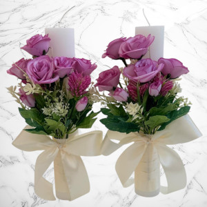 2 lumânări de nuntă cu trandafiri mici lila, decorate manual