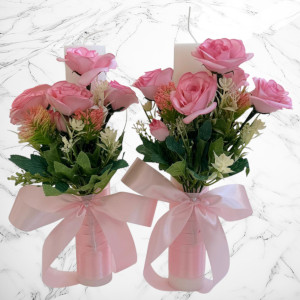 Setul este realizat manual și include lumânări de nuntă decorate cu trandafiri roz, buchet de mireasă asortat și cocardă pentru mire, toate concepute pentru a crea un aspect unitar și rafinat în cadrul ceremoniei religioase și al evenimentului.