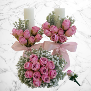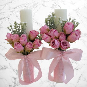 Setul este realizat manual și include lumânări de nuntă decorate cu trandafiri roz, buchet de mireasă asortat și cocardă pentru mire, toate atent concepute pentru un aspect unitar și echilibrat.