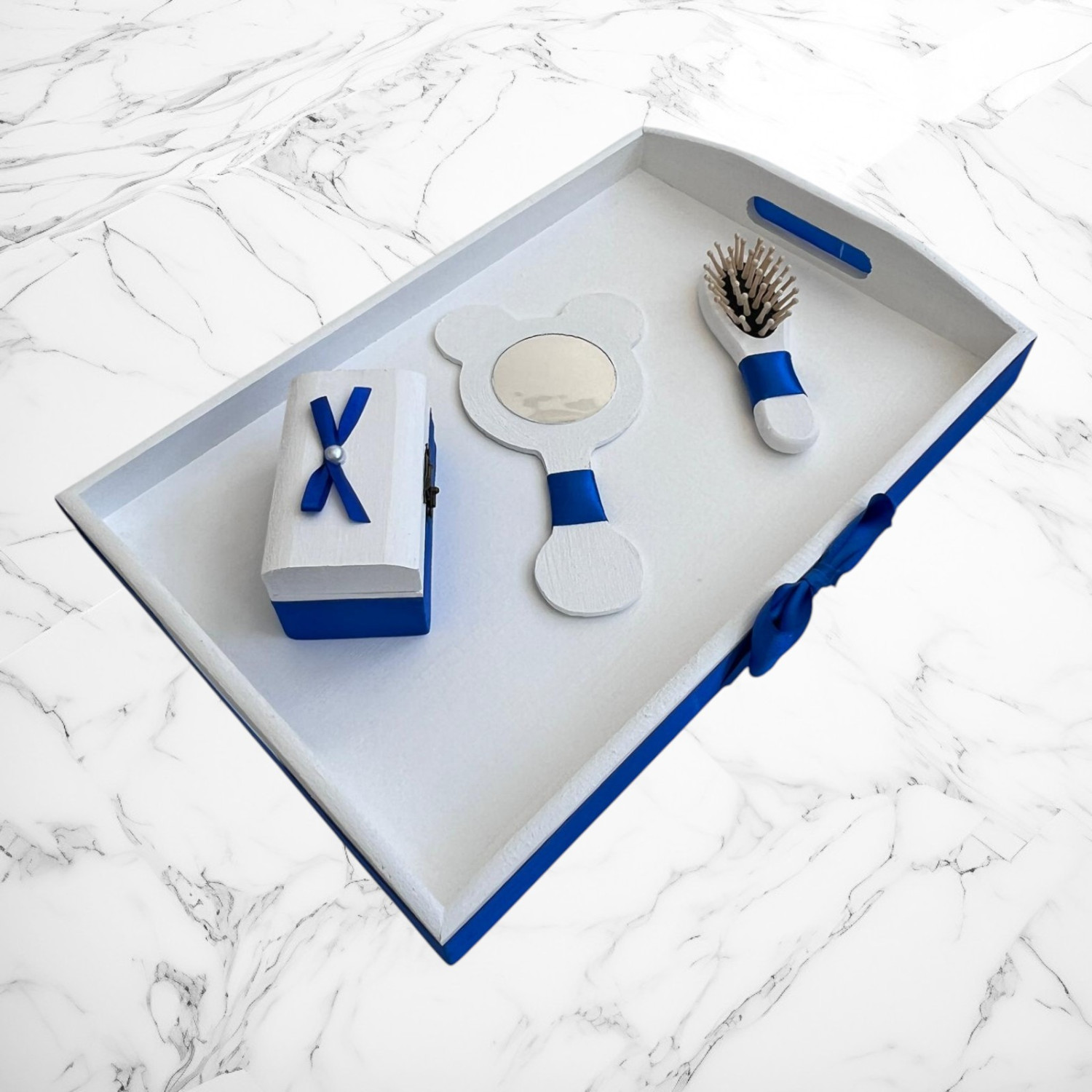 Acest set moț este alegerea ideală pentru aniversarea de 1 an, combinând tradiția cu un design modern, în nuanțe elegante de alb și albastru. Fiecare piesă este realizată cu grijă și atenție la detalii pentru a transforma tăierea moțului într-un moment cu adevărat special!