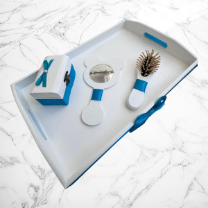 Acesta este un set pentru tăierea moțului, realizat într-o tematică elegantă alb-turcoaz. Setul include: