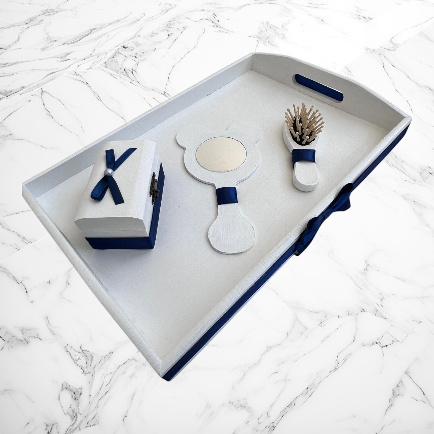 Tăviță decorativă din lemn, vopsită în alb cu accente verde (inclusiv o fundiță laterală) – ideală pentru prezentarea obiectelor într-un mod festiv.
