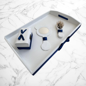 Acesta este un set pentru tăierea moțului, realizat într-o tematică elegantă alb-verde. Setul include: