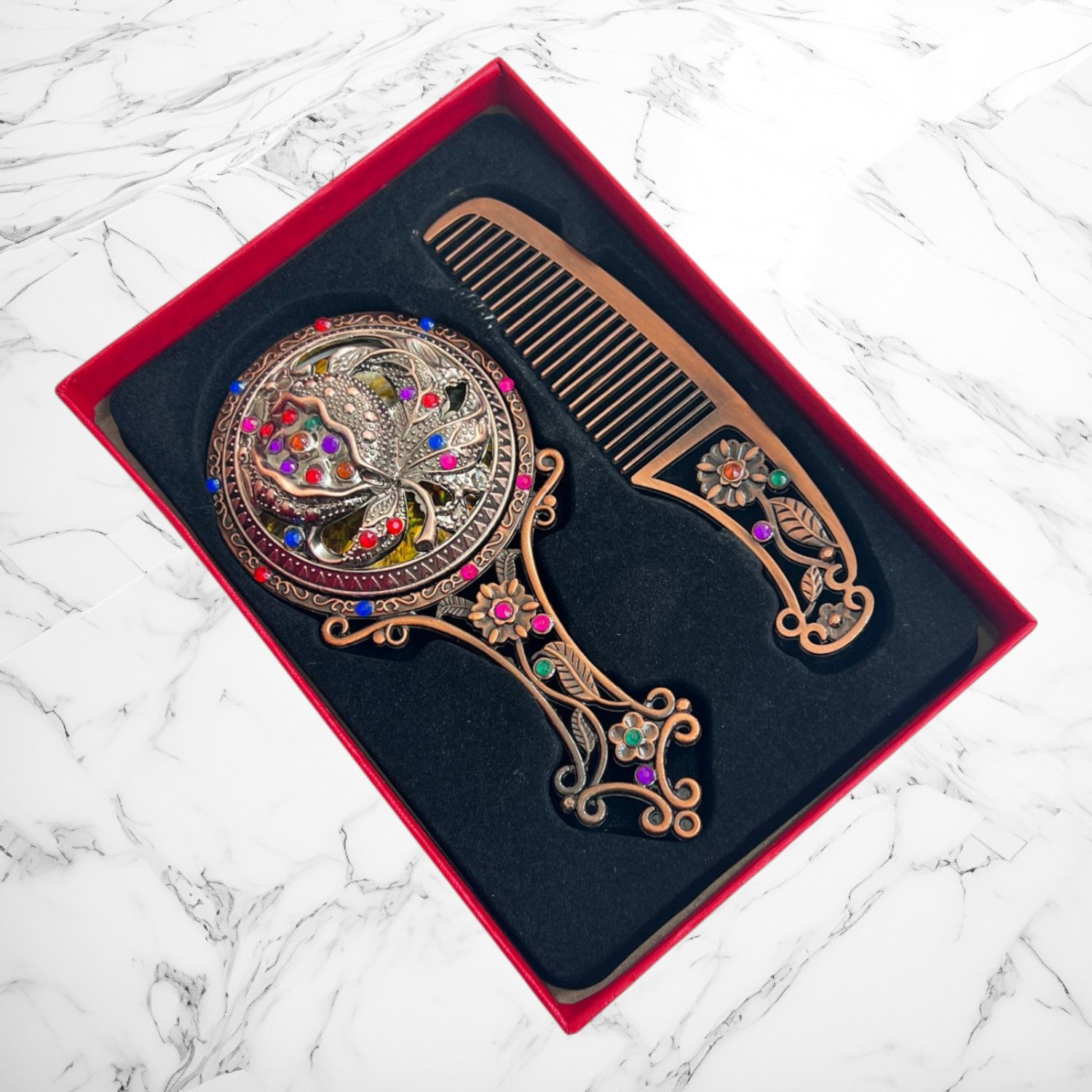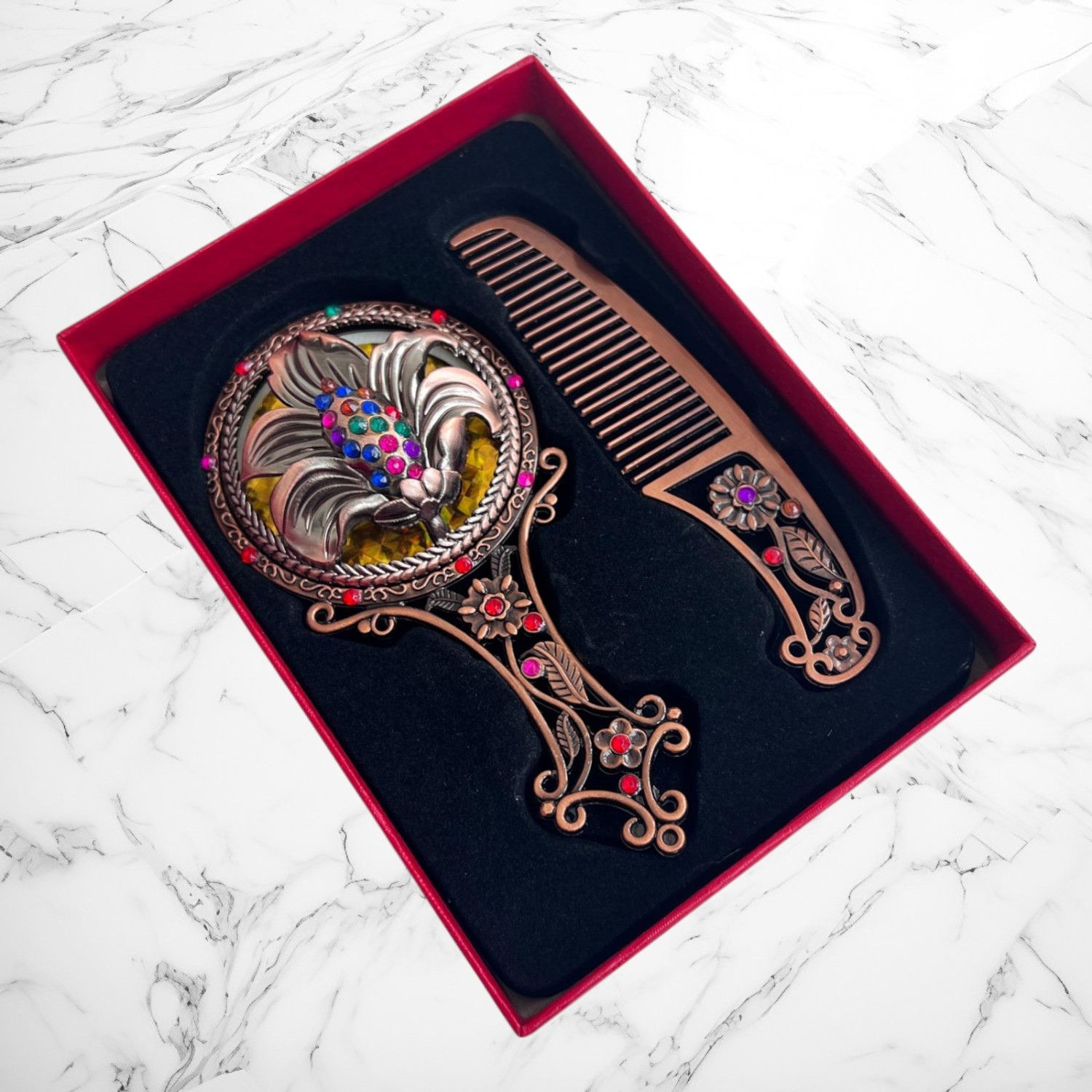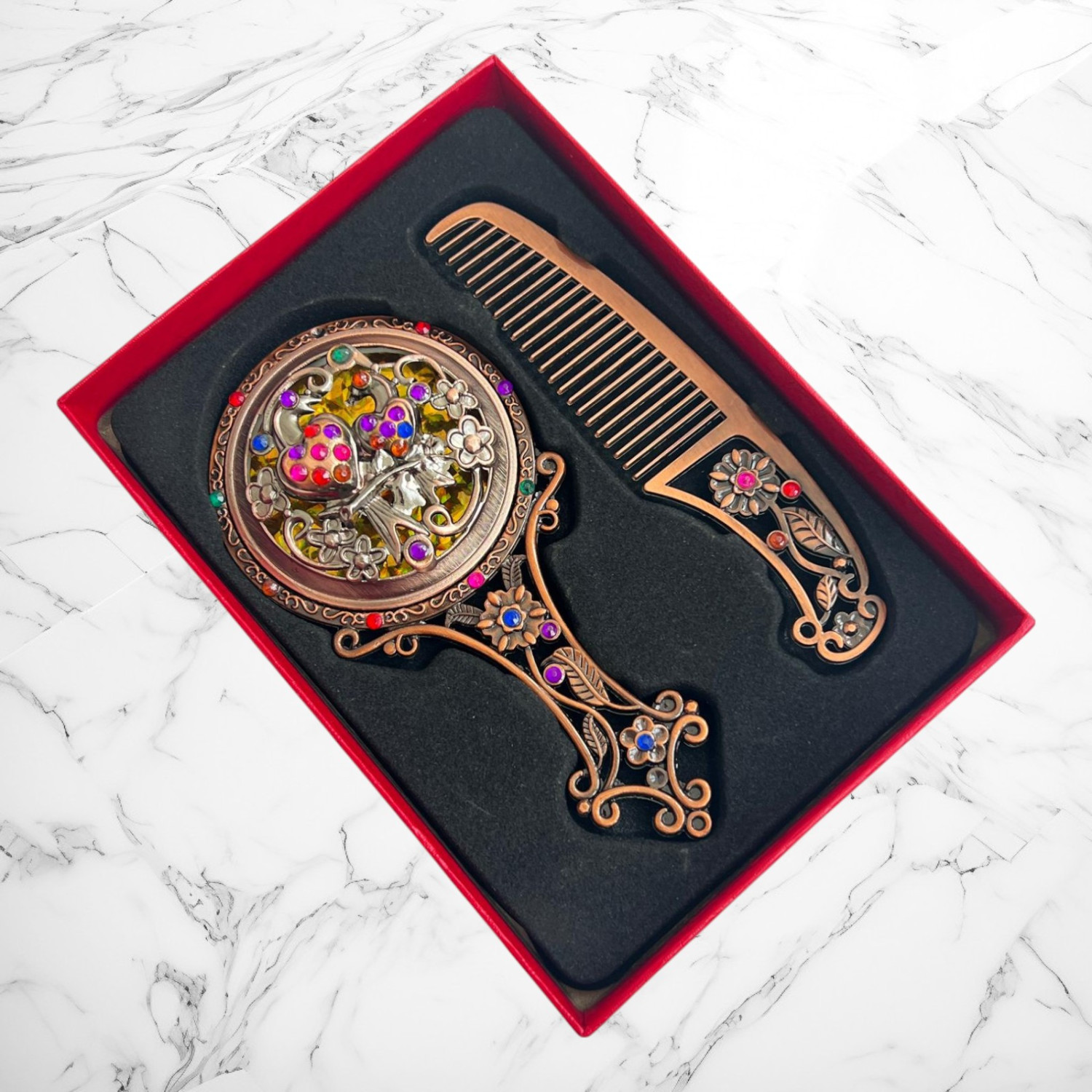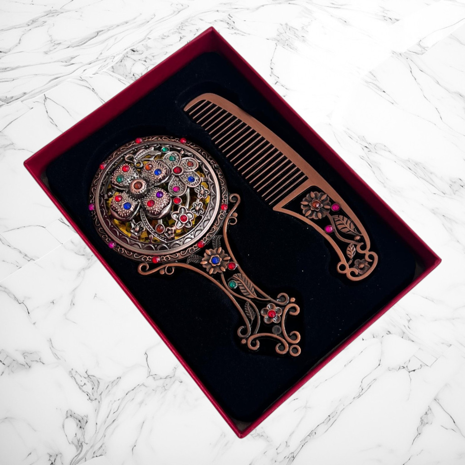 set oglindă pieptăn vintage, cadou turtă fetiță, pieptăn decorativ, oglindă de mână cu pietre, set retro elegant, trusou moț lux, accesorii ceremonie turtă, set fetiță cutie roșie, oglindă moț fetiță