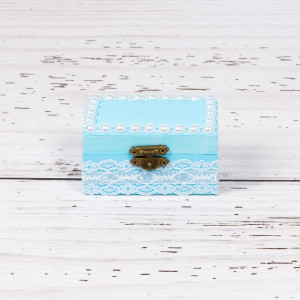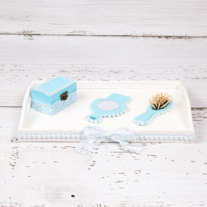 Accesoriile bleu au decor manual, articolele din set fiind imprejmuite cu un sirag perlute. La petrecere vor participa si nasii baietelului. Nasa va taia motul, iar parintii vor pastra parul copilasului in cutiuta pentru prima suvita.