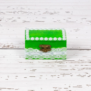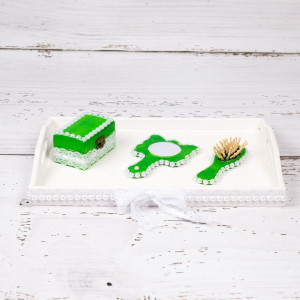 Accesoriile din acest set verde cu sirag de perle si dantela alba au decor lucrat manual. Dupa ce nasa va taia motul copilului, parintii micutului vor pastra in cutiuta in forma de cufar suvita de par in semn de amintire.