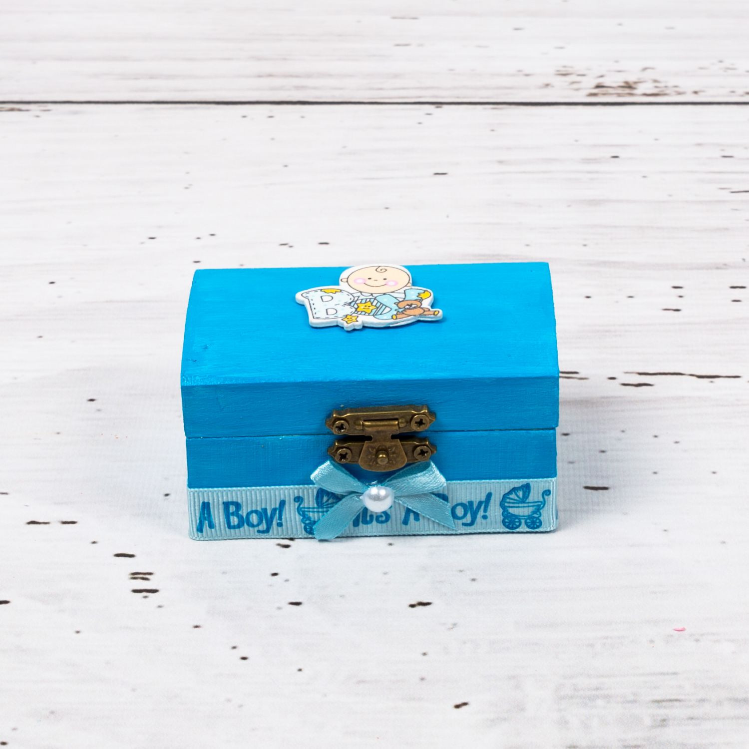 - cutiuta pentru prima suvita decorata in albastru deschis cu banda It s a boy si fundita asortata cu figurina Boy pe capac,