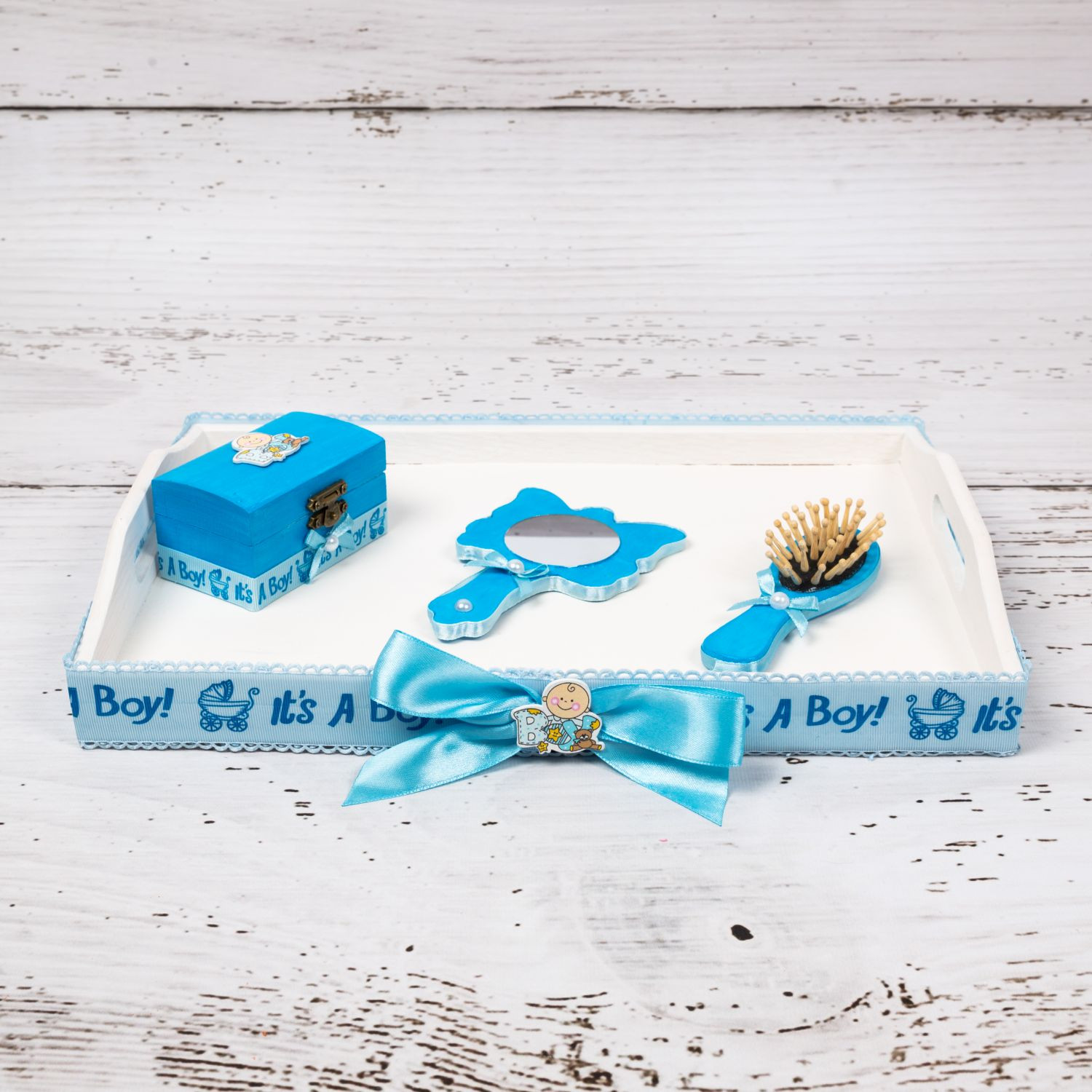 - tavita cu decor banda bleu It s a boy, funda bleu si figurna baietel in mijloc cu mesajul Boy. Dimensiuni tavita: 35 cm x 23 cm x 5 cm (L x l x H).