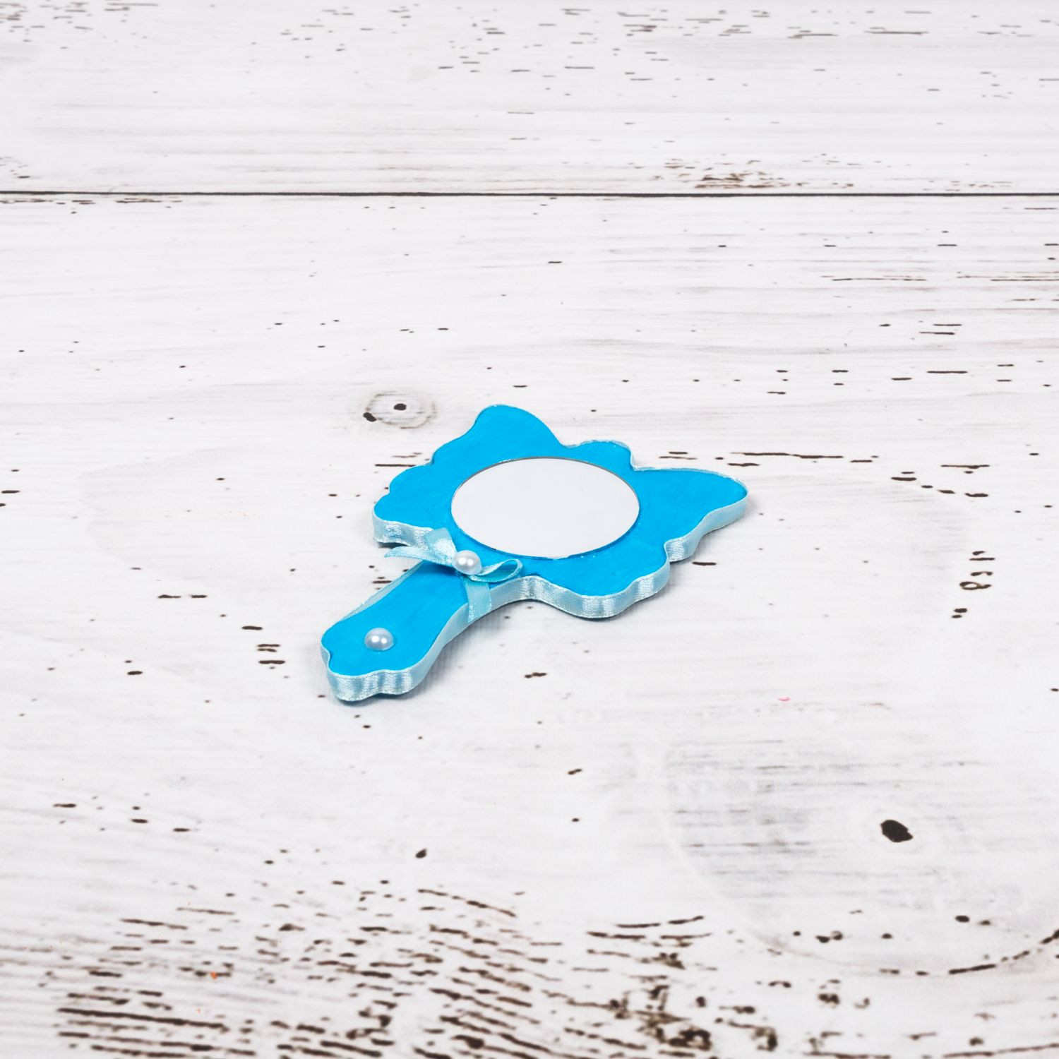 - oglinda cu decor bleu si fundita cu perluta in mijloc. Aceasta are o lungime totala de 13 cm. Diametru oglinda: 5 cm.