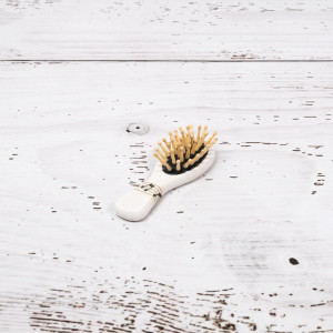 Cele patru articole care alcatuiesc acest set este compus din: tavita cu manere, oglinda, perie de par si cutiuta in forma de cufar pentru prima suvita.