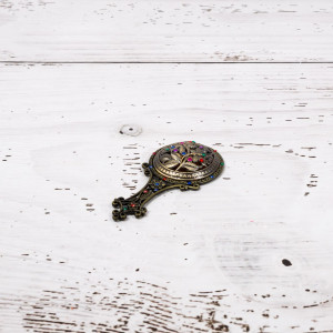 Oglinda este decorata cu mici pietricele colorate, iar cutiuta in forma de hexagon pentru prima suvita are pe capac trei trandafiri.
