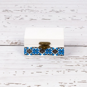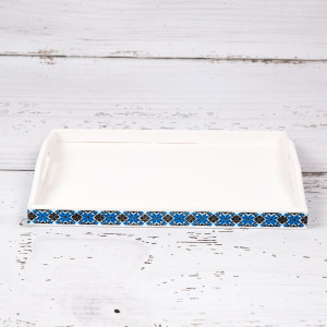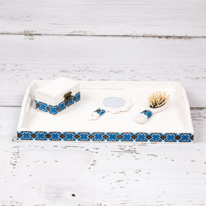 Vopseaua alba folosita pentru a decora produsele este non-toxica. Cele patru articole care compun acest set sunt decorate manual cu o banda cu decor traditional albastru pentru baieti.