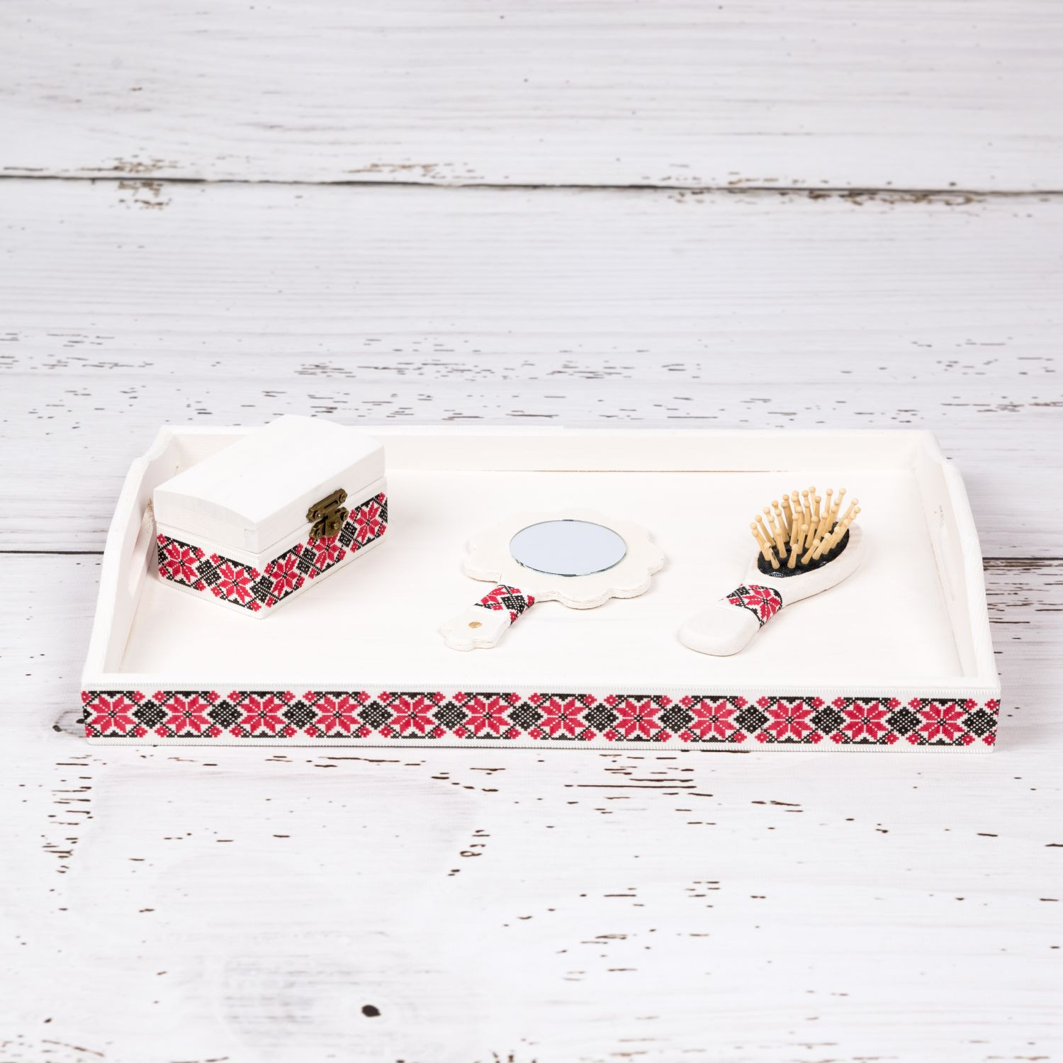 Vopseaua alba folosita pentru a decora produsele este non-toxica. Cele patru articole care compun acest set sunt decorate manual cu o banda cu decor traditional rosu pentru fetite.