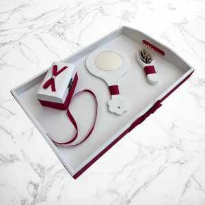 Tăviță decorativă din lemn, vopsită în alb cu accente grena (inclusiv o fundiță laterală) – ideală pentru prezentarea obiectelor într-un mod festiv.