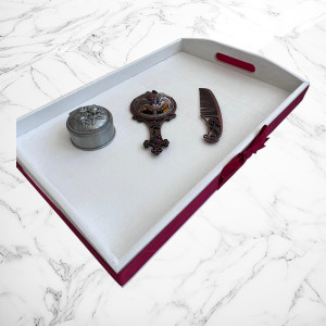 Tăviță decorativă din lemn, vopsită în alb cu accente grena (inclusiv o fundiță laterală) – ideală pentru prezentarea obiectelor într-un mod festiv.