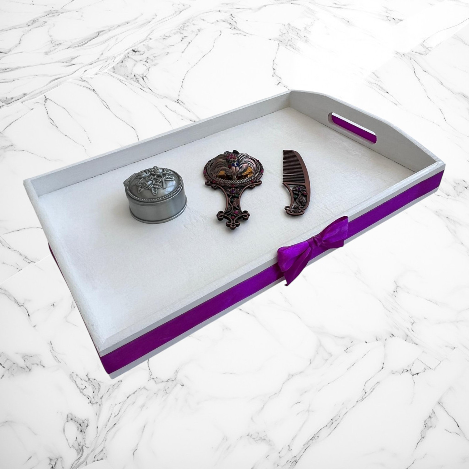 Tăviță decorativă din lemn, vopsită în alb cu accente mov (inclusiv o fundiță laterală) – ideală pentru prezentarea obiectelor într-un mod festiv.
