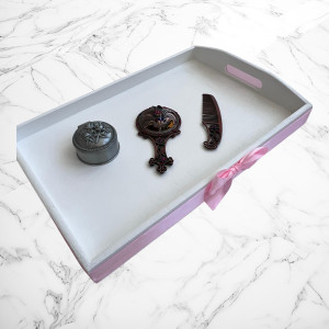 Pieptăn metalic asortat, ideal pentru momentul simbolic al aranjării părului.