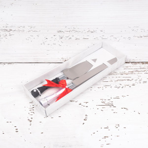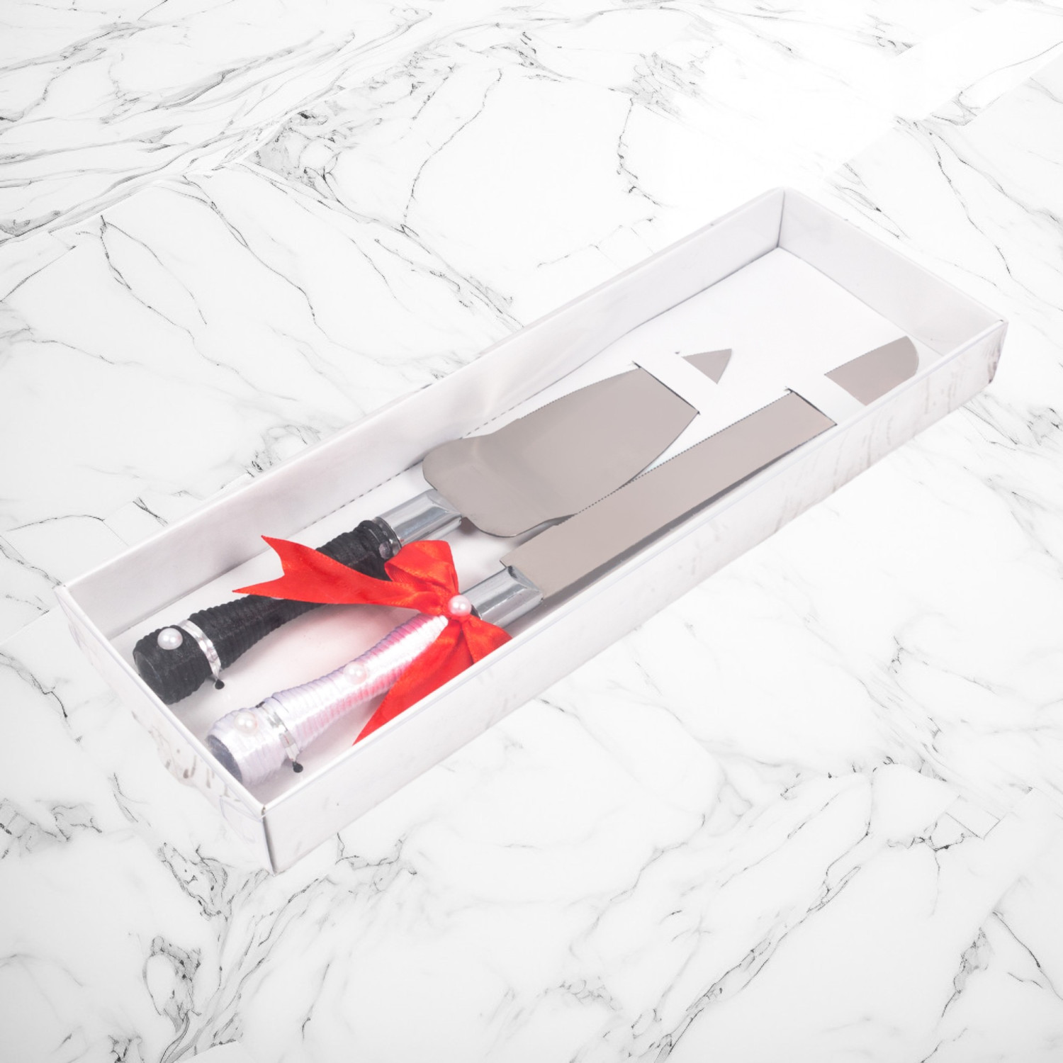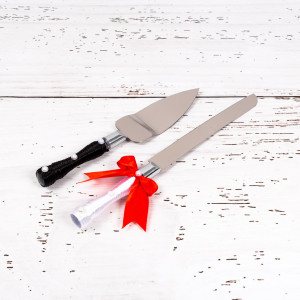 Setul de tort este compus din cutit si paleta, fiecare tacam fiind accesorizat cu cate o fundita satinata rosie si perlute albe.