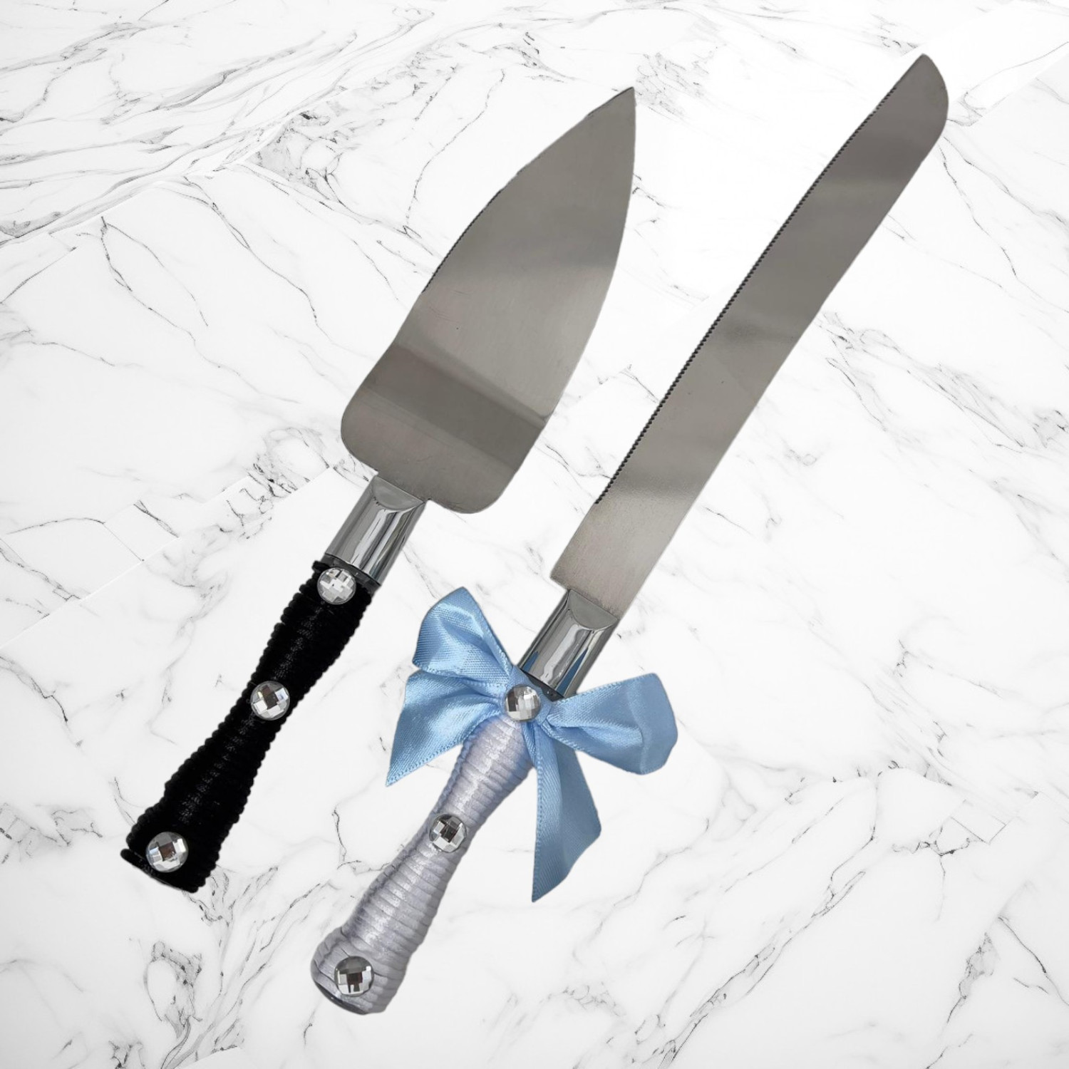 Pentru mirii care prefera accesoriile de tort clasice, setul de tacamuri Mire si Mireasa cu funda bleu sunt o alegere ideala. Aceste tacamuri cu snur alb (cutit), respectiv snur negru (paleta) sunt perfecte pentru taierea tortului.
