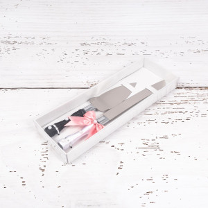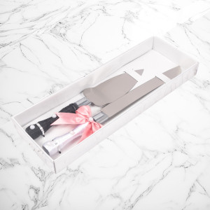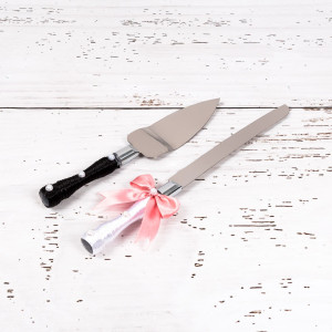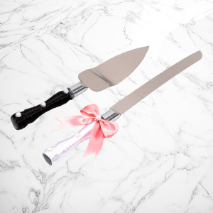 Manerul cutitului este infasurat in snur alb, iar manerul de la paleta in snur negru. Simbolic, cele doua accesorii reprezinta vestimentatia clasica a mirilor, iar ambele tacamuri au ca decor cate o fundita roz, ce poate fi in stransa legatura cu tema evenimentului.