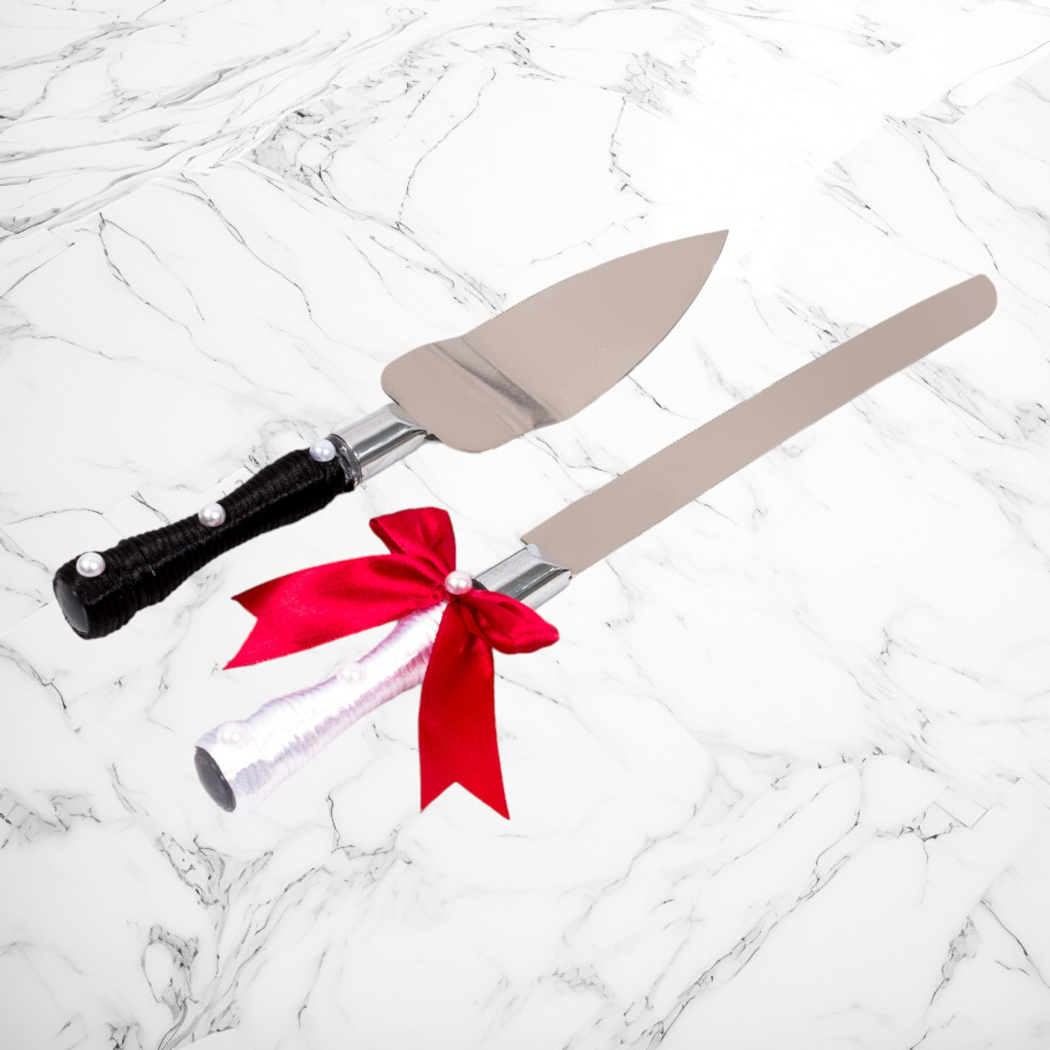 Setul de tort este compus din cutit si paleta, fiecare tacam fiind accesorizat cu cate o fundita satinata bordo si perlute albe.