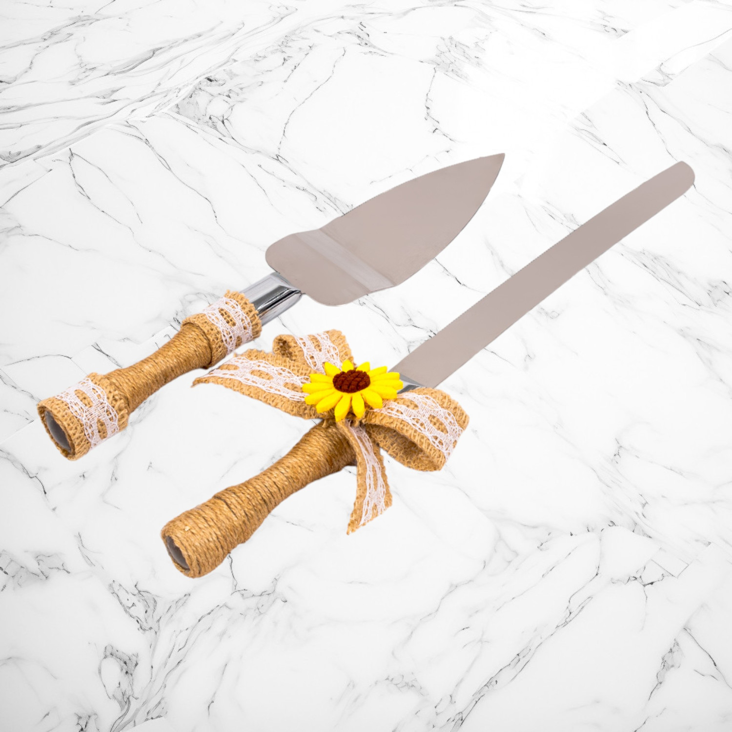 Cele doua ustensile realizate din otel inoxidabil sunt ideale pentru nuntile in stil rustic.