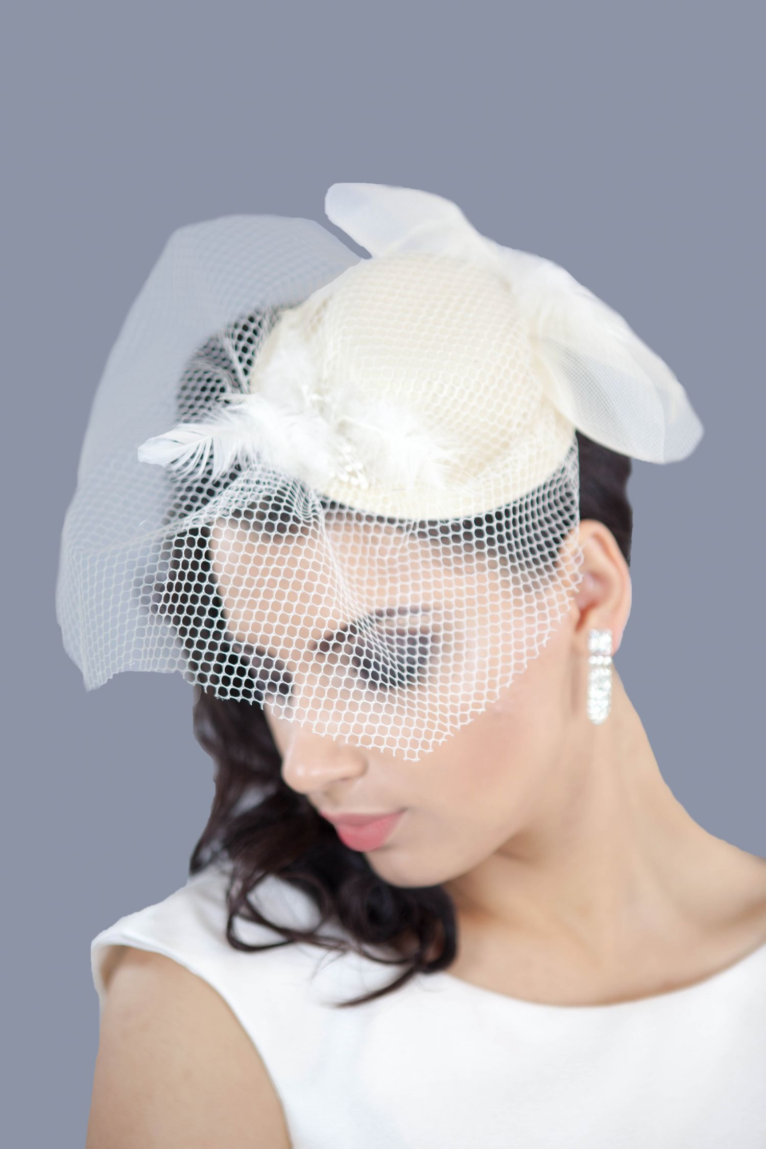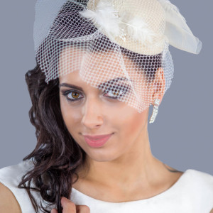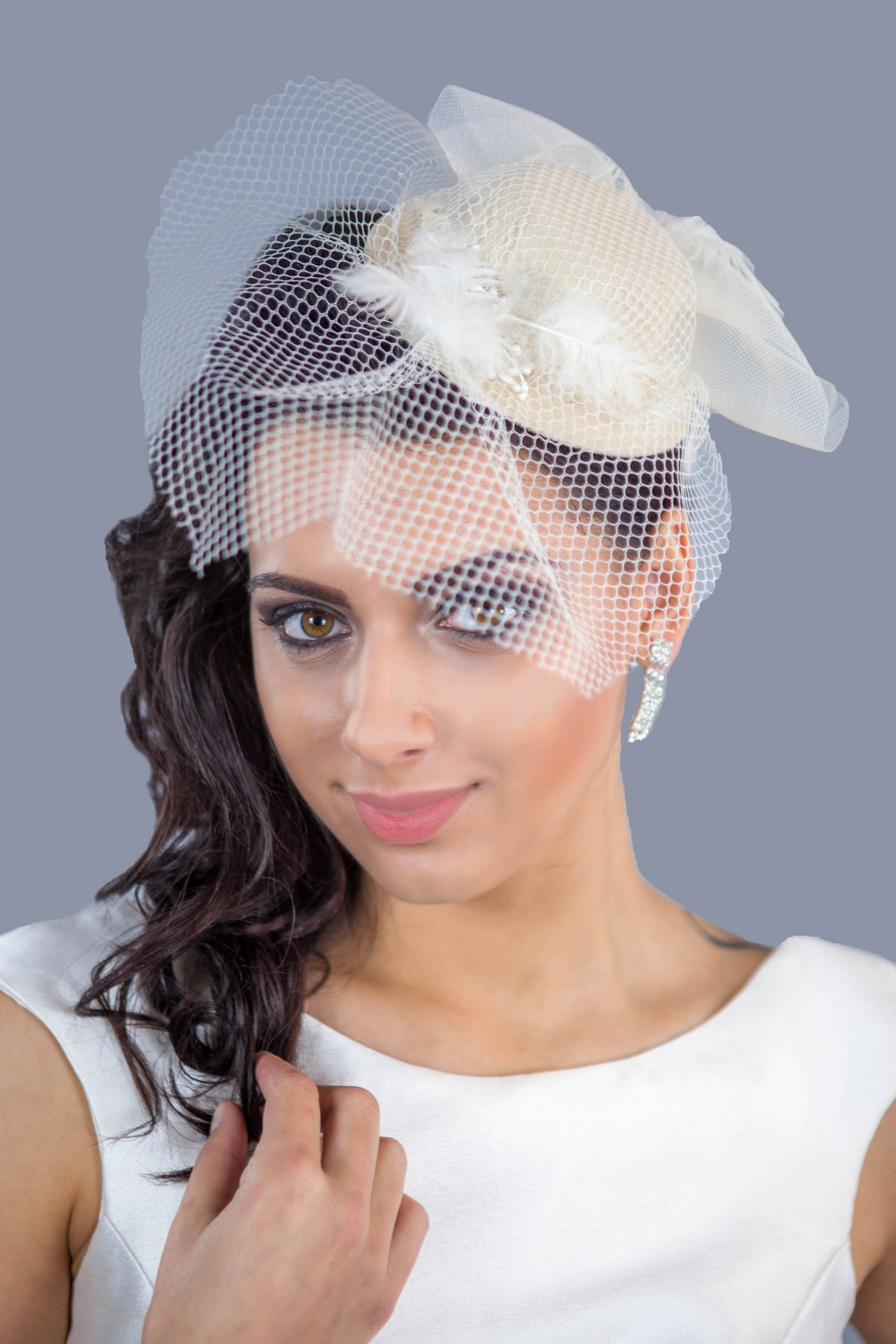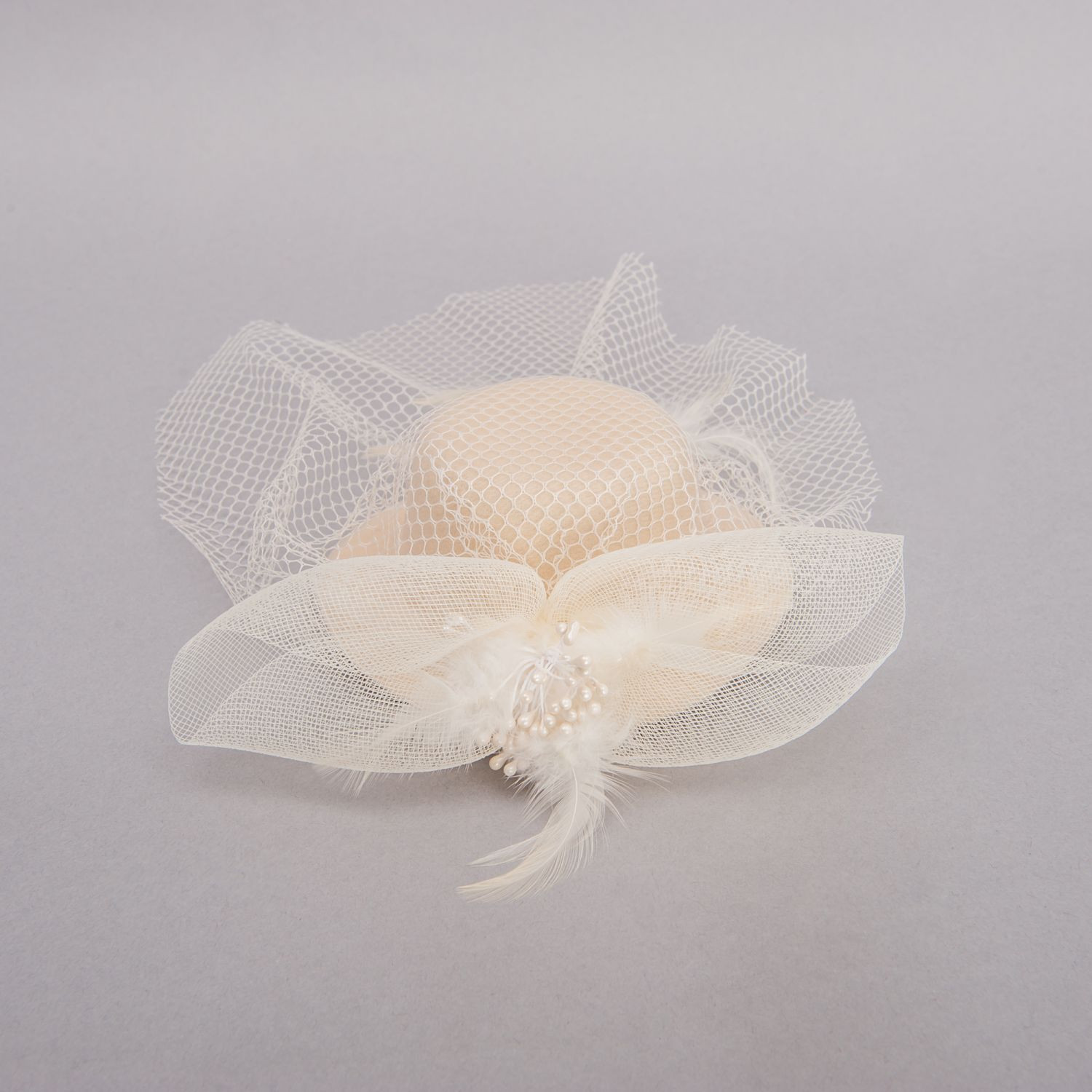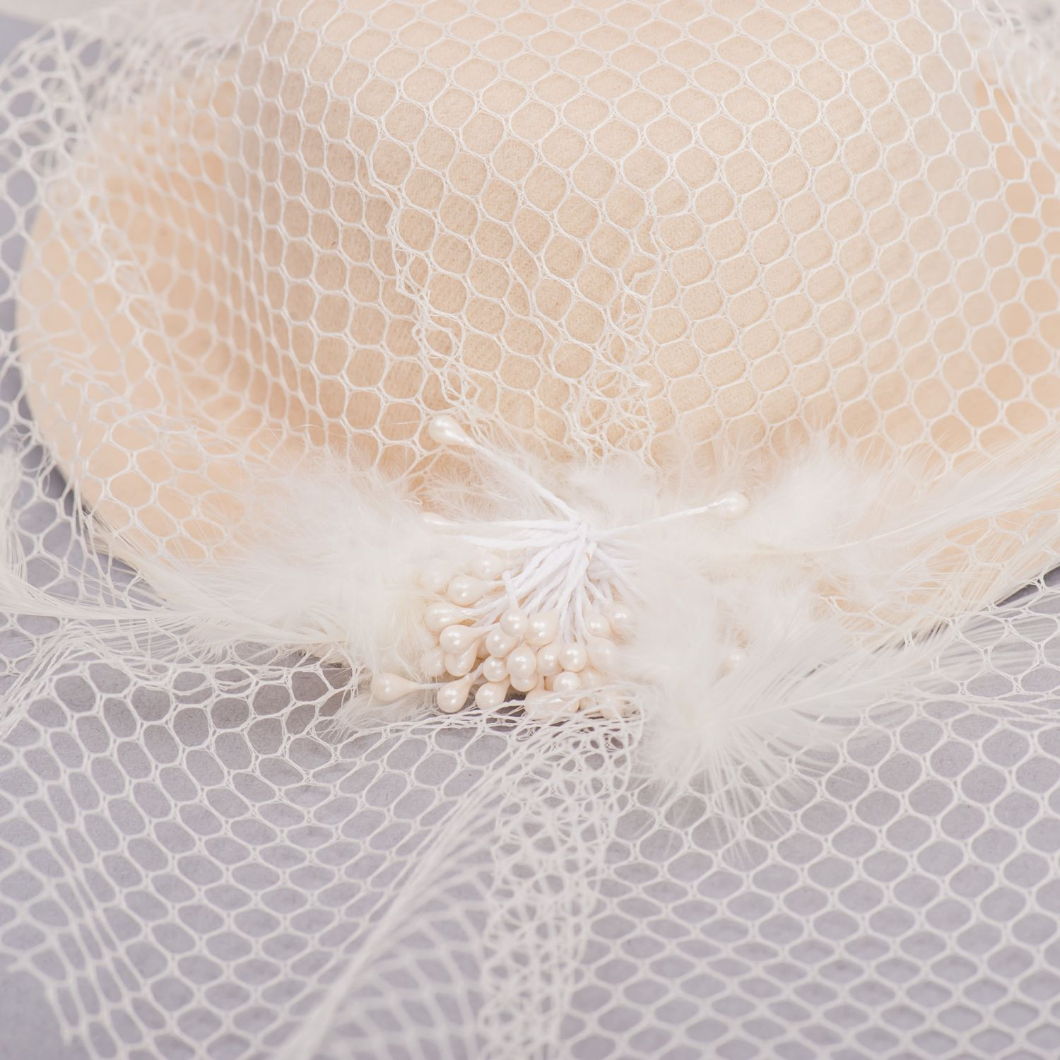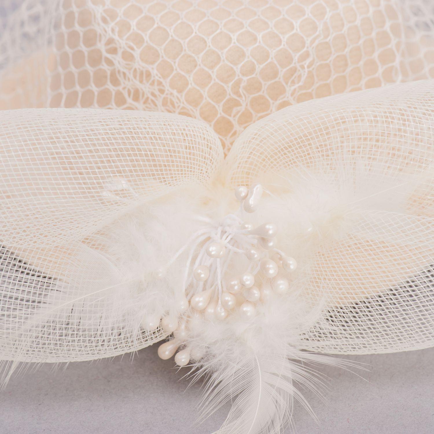 Voaleta de mireasa Brook ivory este formata dintr-o mini-palarie de fetru si plasa, decorata cu puf.