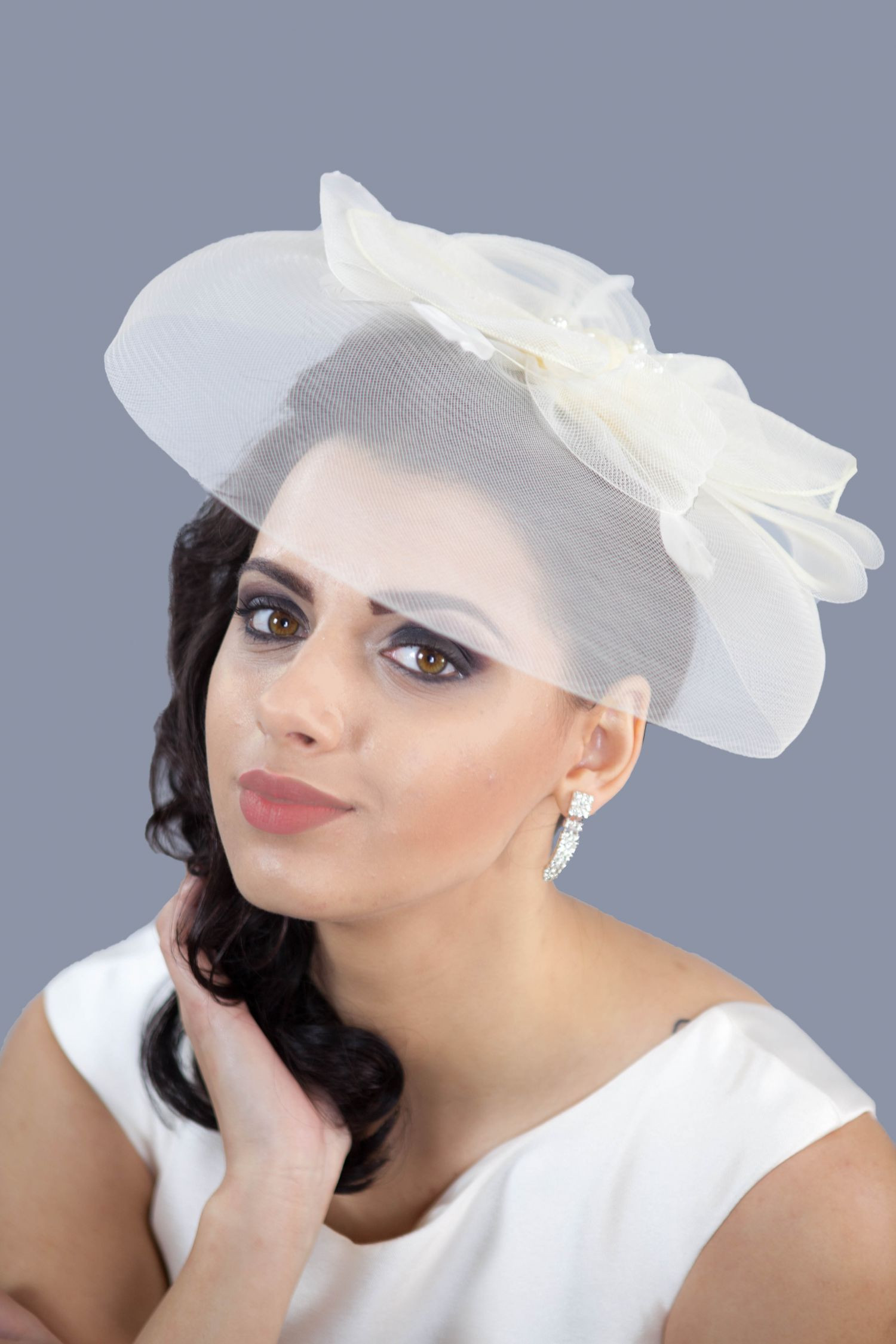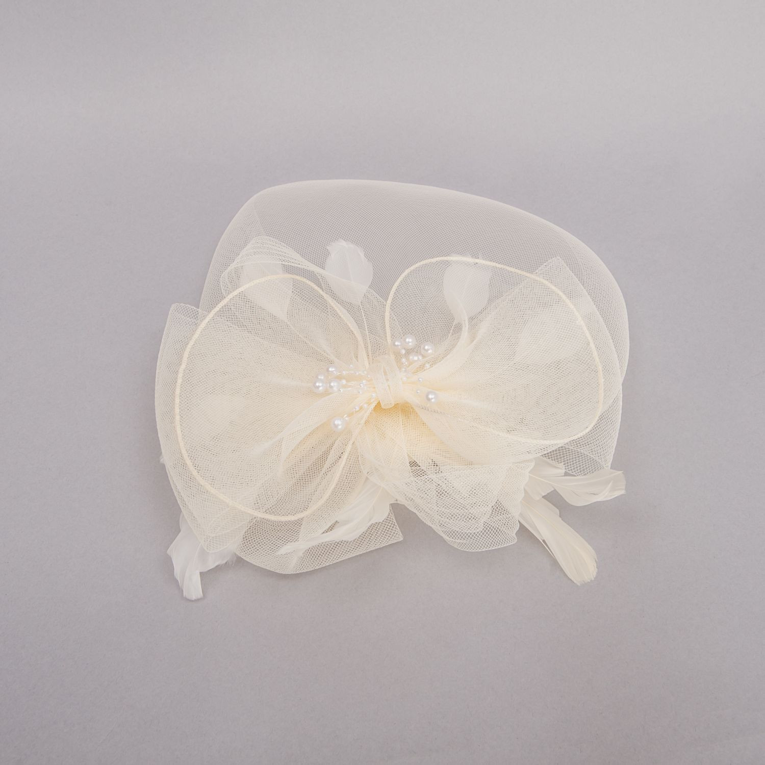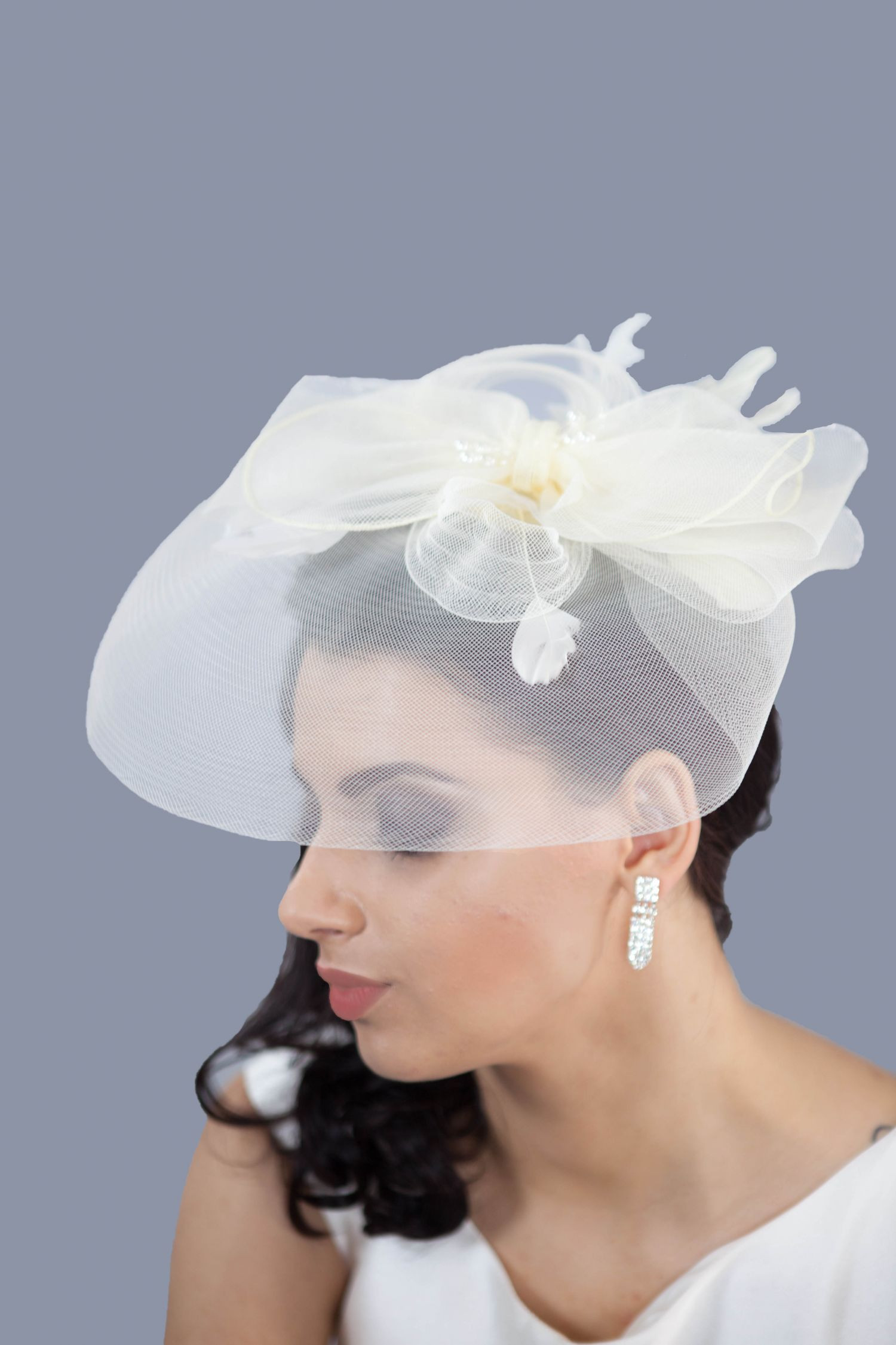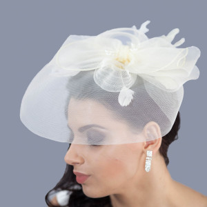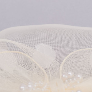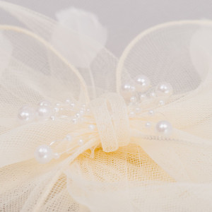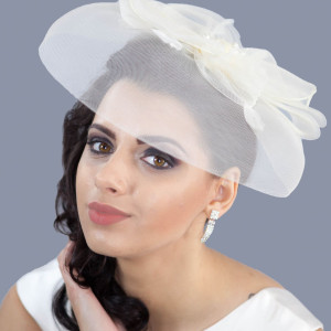 Voaleta de mireasa Bailey, ivory cu funda, margele si pene este realizata din tesatura de Sinamay, ce pune in valoare orice coafura de la cocul clasic la parul desfacut.