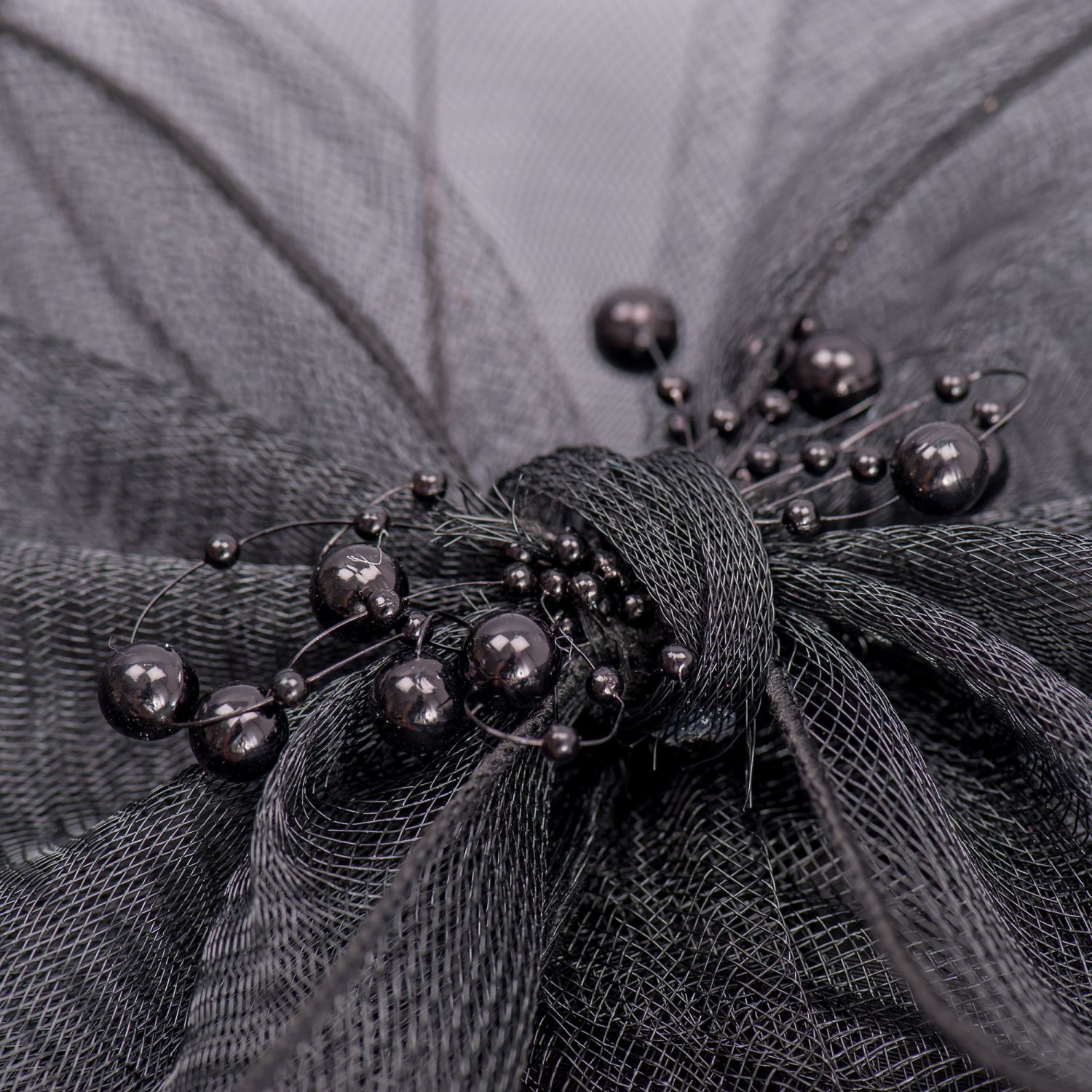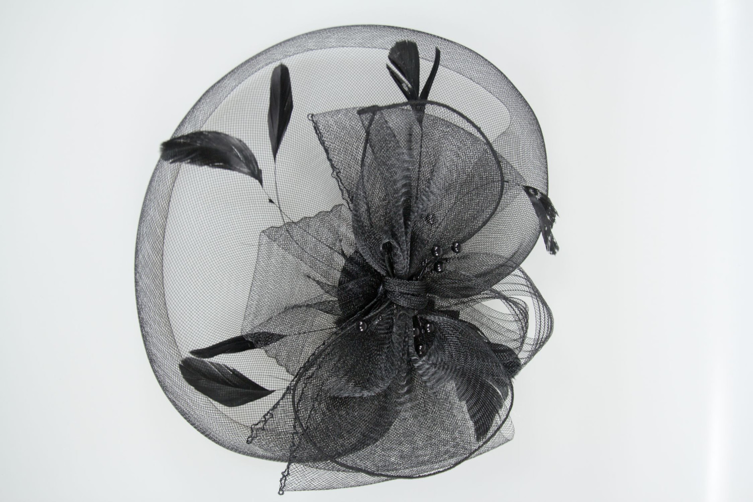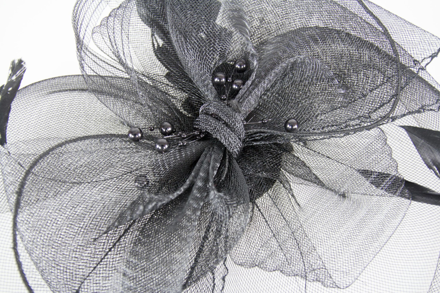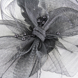 Da tonul petrecerii si completeaza-ti tinuta festiva cu aceasta voaleta de ocazie neagra cu funda, margele si pene.