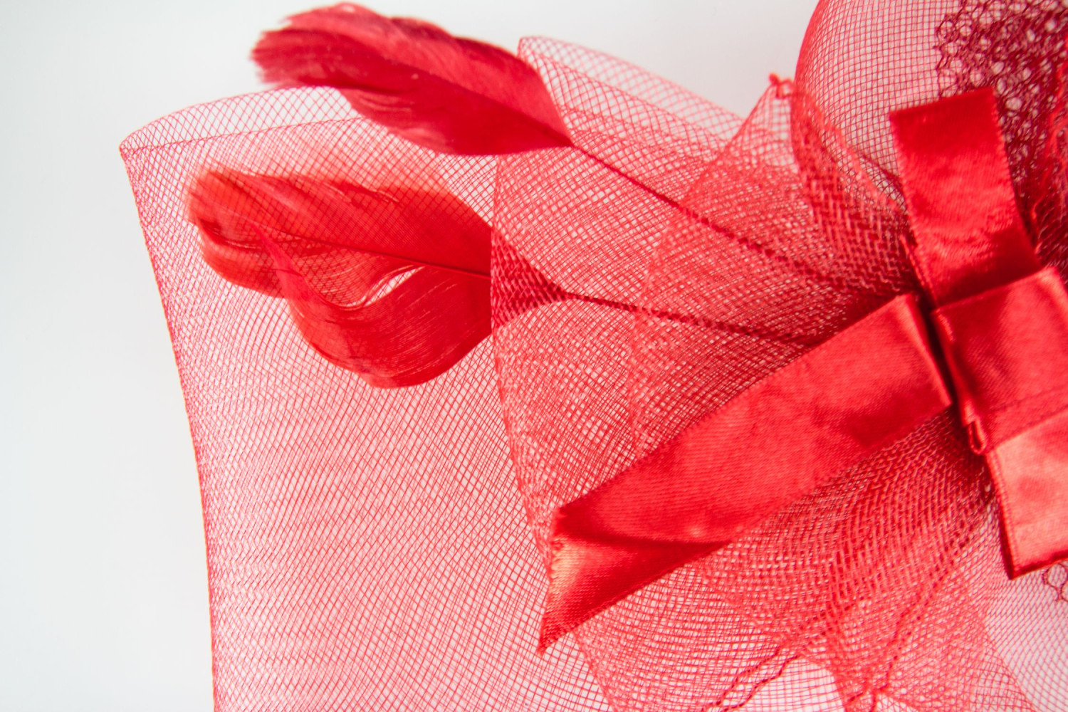 Voaleta de ocazie Barbara, realizata dintr-un material originar din Filipine are plasa si este decorata cu fundita din satin rosu si pene in aceeasi culoare.