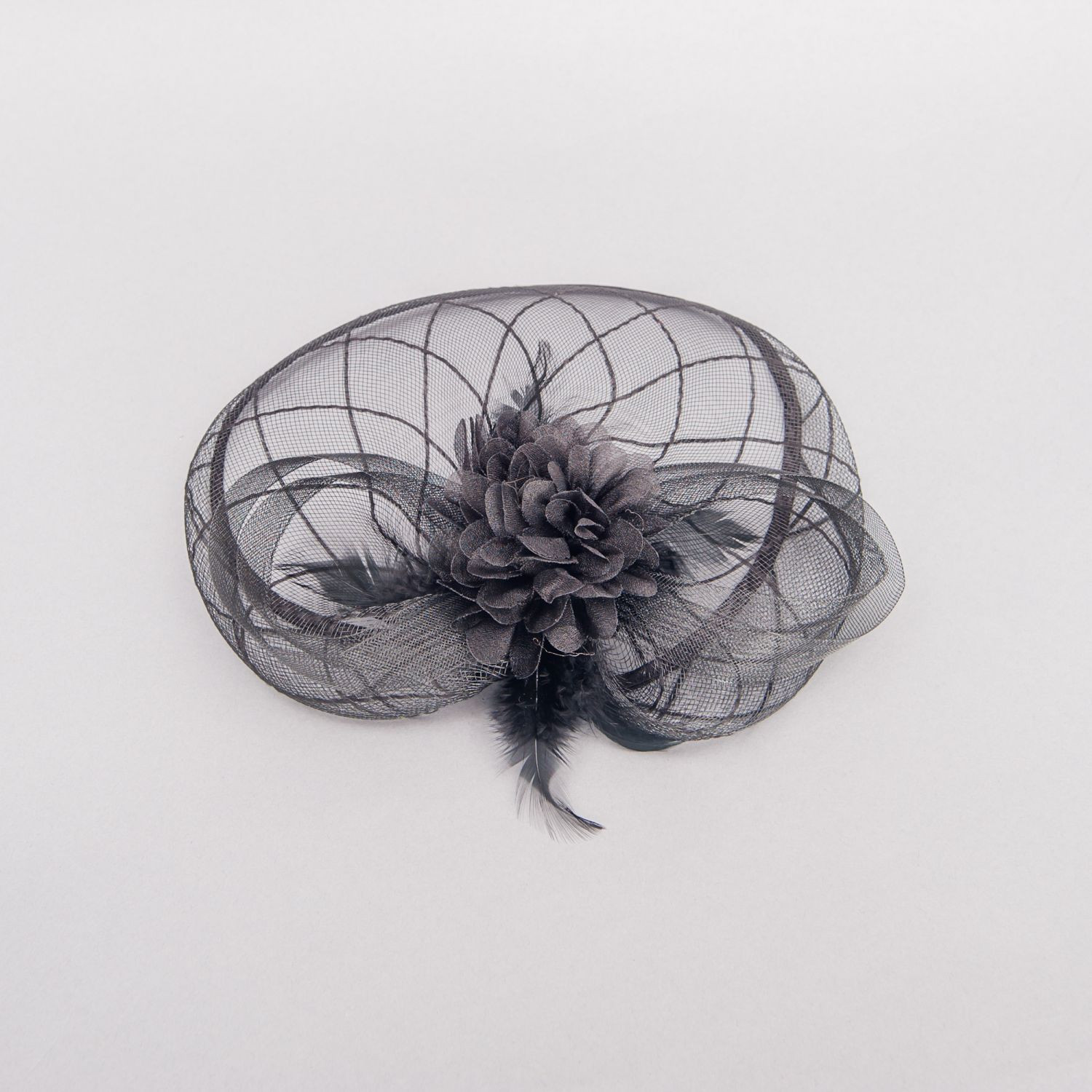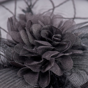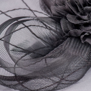 Voaleta de ocazie Bella are un design fascinant, este realizata din tesatura de Sinamay si accesorizata cu o floare neagra si puf.
