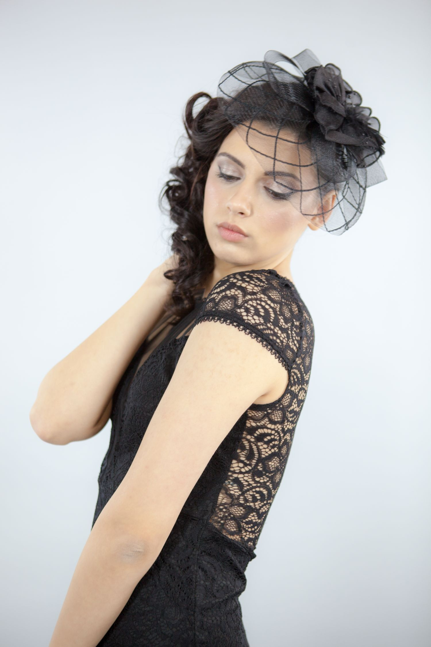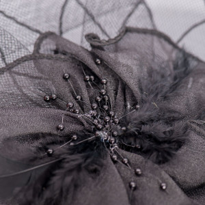 Voaleta este realizata din tesatura de Sinamay si decorata cu o floare, panglica prinsa sub forma de fundite, margele si puf.