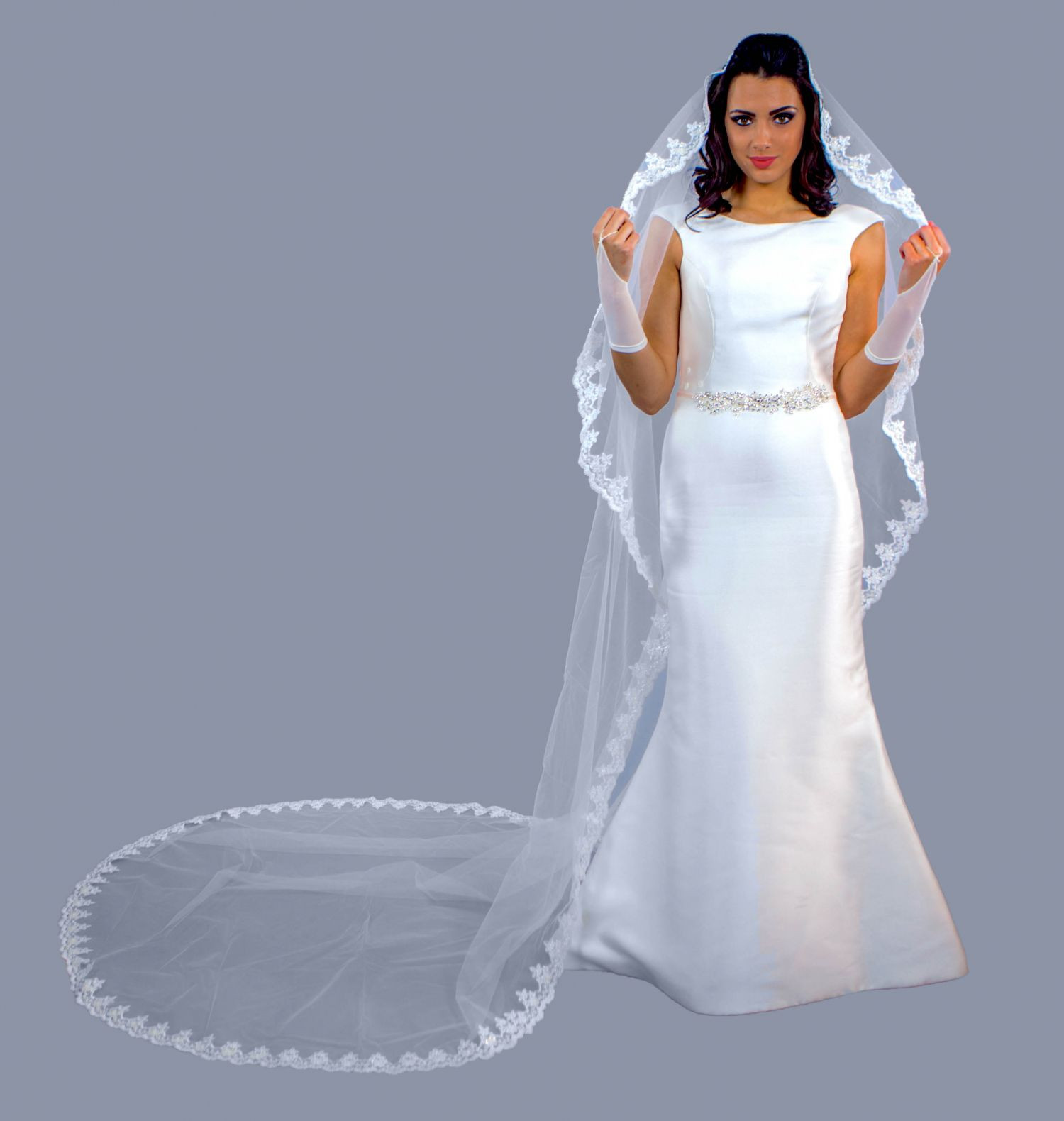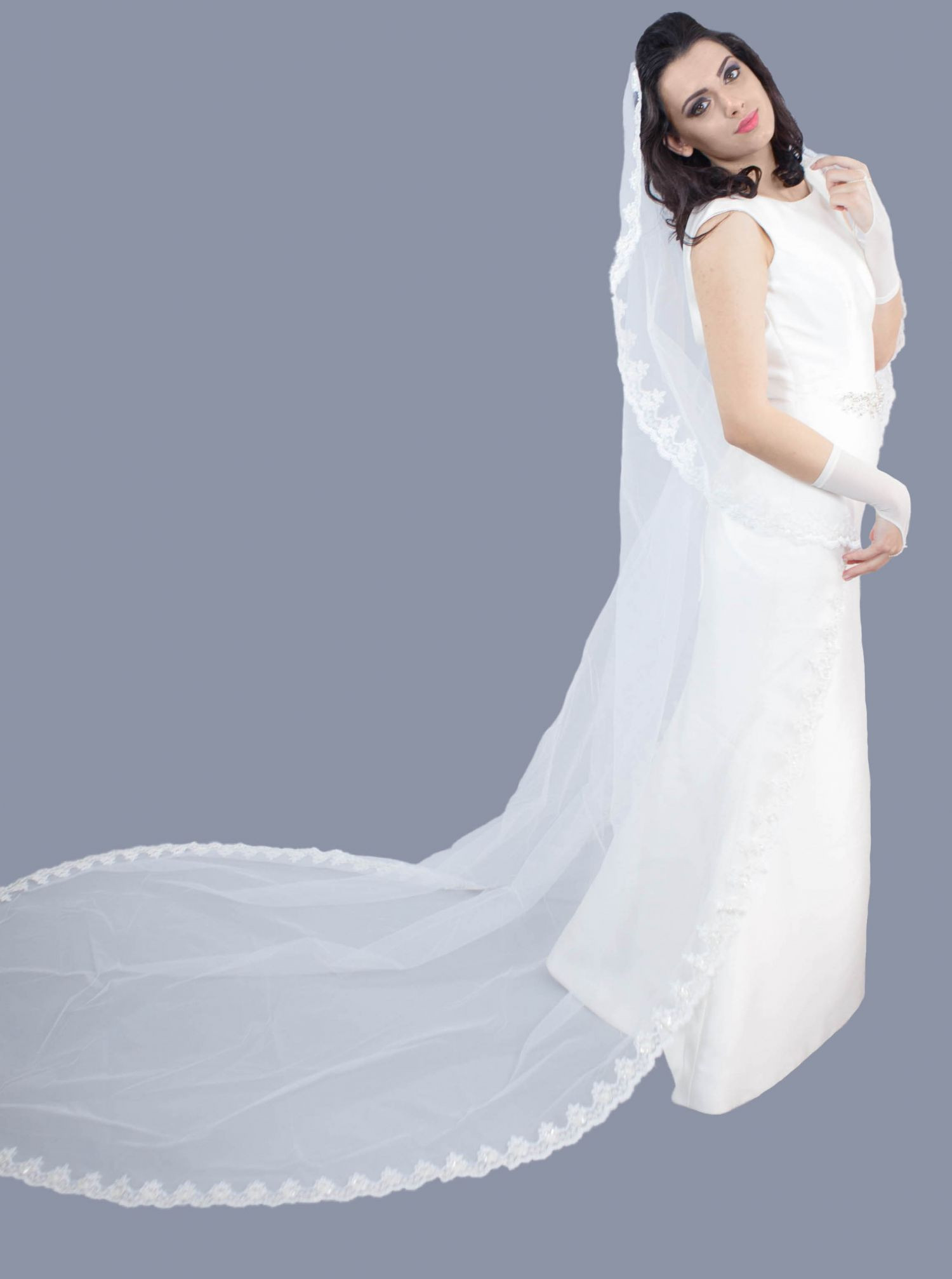 Acest voal in stil spaniol atinge pamantul si confera un aer regal rochiei de mireasa.